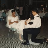 For her big day, Michelle chose an off-the-shoulder design and styled it with a pair of sheer stockings and white satin pumps. She accessorized her gorgeous wedding dress with a poofy veil and statement drop-pearl earrings. Keep reading to have a closer look at Michelle's beautiful dress, and try not to cry.