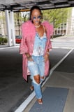 Of course, we'd never dream up this look ourselves - Rihanna styled a teeny-tiny denim skirt, half unbuttoned, over her tank, calling out the layering trick on Instagram: "when yo skirt too short." To round out the ensemble, Rihanna wore baggy jeans, transparent mules, flashy diamonds, a pink Marc Jacobs coat, A Fendi mini Peekaboo bag, blue lenses, and a new "Savagex" necklace, which will hopefully be for sale at some point too.