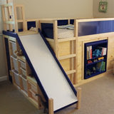 Eric incorporated his son's interests - playgrounds, hiding, simple machines, and the Berenstain Bears - into the bed design, which features a hidden clubhouse, swinging bookshelf opened by a secret book lever, secret window, pulley and crane, and more.