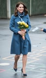 When Kate Middleton stepped out in London, we were immediately taken by her blue Sportmax coat. Although it isn't the first time that she's worn this piece, the Duchess of Cambridge definitely has a knack for making two similar outfits look different with the mere removal or, in this case, addition of accessories. And who doesn't love seeing her wearing her power color?