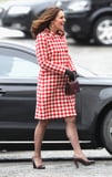 The red and white houndstooth piece couldn't have been more perfect for Kate. Accessorized with a pair of fringed heels from Tod's, her gorgeous Chanel bag, and a pair of pearl earrings by the Swedish brand In2Design, it was a great pop of color, which perfectly complemented her cream Alexander McQueen dress. Read on to get a closer look at her outfit, shop similar options for your own outerwear collection, then see what Princess Victoria wore for the occasion.