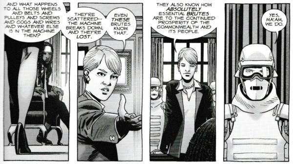 Not much is known about the group of survivors since it's so new to the comics, but it boasts advanced equipment and the leader, Pamela Milton, looks physically similar to Georgie (the blonde hair, the blazer). The introduction of this group could also be the answer to who was flying that helicopter Rick saw earlier on in season eight.