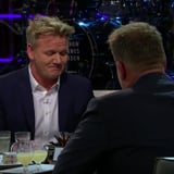 You know you're in for a hilarious video when Gordon Ramsay and James Corden sit at a table full of weird foods. In a new "Spill Your Guts or Fill Your Guts" segment on The Late Late Show With James Corden, the celebrity chef and host dodge awkward questions in favor of digging into some true delicacies like clam juice, pickled pigs' feet, and bull penis with hot sauce. James takes a dig at Gordon, saying, "I've eaten worse. I've eaten at a couple of your places." (He must not be talking about Gordon's newly opened Hell's Kitchen restaurant.)