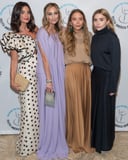 Coordinating outfits with your partner in crime is right on trend this season, and MK and A pulled it off in their signature party look: long, floor-sweeping pleated skirts, turtlenecks, statement earrings, and flats. While Mary-Kate went the neutral route, completing her ensemble with bright emerald baubles, Ashley stayed more muted in navy blue.