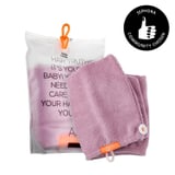 To use the turban, I flip over my head and hang the towel over it. I scoop my hair into the towel, twist it up and away from my face, and hook it to the button located at the nape of my neck. The button ensures it's hooked securely to my head, so I can do chores around my apartment without it sliding off.