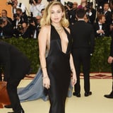 Miley Cyrus did not come to mess around at the 2018 Met Gala. She walked the "Heavenly Bodies: Fashion and the Catholic Imagination" red carpet in a breathtaking Stella McCartney halter gown that showed off skin in the front and in the back, giving a glimpse of her collection of tattoos. Miley paired the sleek dress with strappy black heels, cross earrings, and layered necklaces, including a thin chain that wrapped around her lower back. She's definitely no stranger to baring skin at the ball - in 2015, she turned heads with her punk-inspired Alexander Wang look complete with sexy cutouts.