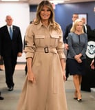 While Melania Trump remained absent from the public for nearly a month following a kidney procedure, for which she was reportedly hospitalized for a week, she stepped out with the president for a 2018 hurricane briefing in Washington DC on June 6. The first lady wore one of her signature silhouettes - a trench dress - which was belted at the center and fell below the knee.
