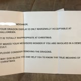 "Neighbor, your dragon display is only marginally acceptable at Halloween," said the note. "It is totally inappropriate at Christmas. It makes your neighbors wonder if you are involved in a demonic cult. Please consider removing the dragons. May god bless you and help you to know the true meaning of Christmas."